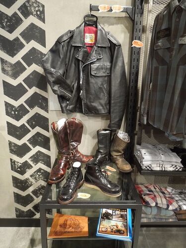 ハーレーダビッドソン宮城のショールームの ウェアコーナーの隅っこに・・・ 1969inc.進出!! 革ジャンは左右でビフォア&アフターが見れます。 ブーツも同じく ジッパー取付、ソール交換、増色などの ビフォア&アフター いろんなソールへ自由に変更! ハ…