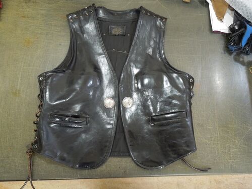 20年以上着込んだ バイカーベスト。 胸の内ポケット部分は 光沢が美しいですが 動く部分はだいぶお疲れさまです。。 特に革ジャンの上に着こむと アームホールがきつくなり破損しております。。 なので ●アームホール拡大 ●首回り補強 ●インナー交換 ●ポケッ…
